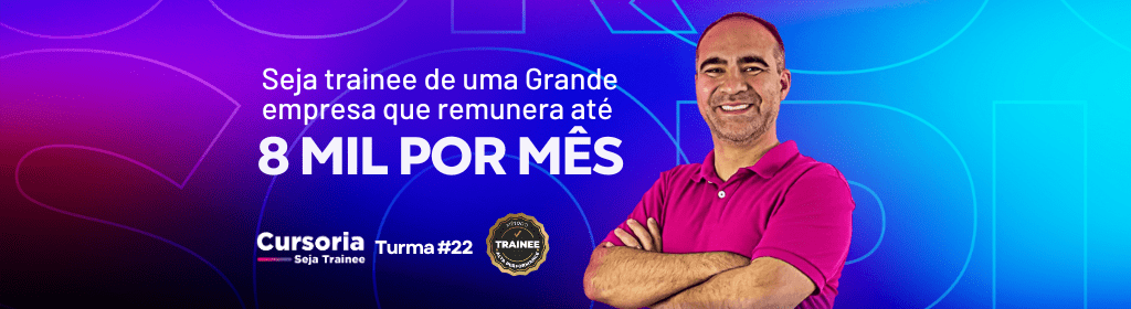 Banner superior do produto. Segue a descrição do conteúdo: A Cursoria Seja Trainee é uma combinação de CURSO digital e MENTORIAS EM GRUPO ao vivo e gravadas para te ajudar a alcançar sua aprovação no trainee de grandes empresas.