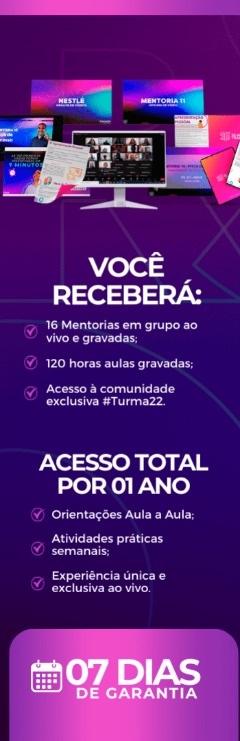 Ao total, são 16 mentorias em grupo ao vivo com 01 aula bônus de Currículo e Linkedin, assim como, mais de 120 horas aulas gravadas da metodologia Seja Trainee.