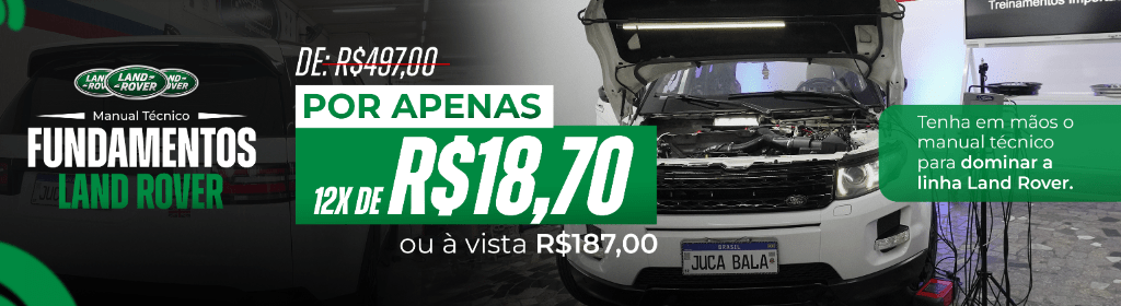Banner superior do produto. Segue a descrição do conteúdo: Tenha em mãos o manual Técnico para dominar a linha Land Rover! Com foco específico na Linha Land Rover, este material Técnico oferece um guia técnico completo para diagnósticos e reparos de veículos dessa marca icônica.
