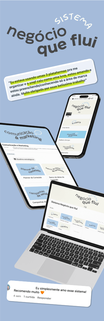 Banner lateral do produto. Segue a descrição do conteúdo: O Sistema Negócio que Flui é um template completo no Notion para empreendedoras que querem ter clareza e organização em todas as áreas do negócio. Nele, você encontra um espaço único e integrado para cuidar de tudo: finanças, conteúdo, tarefas, campanhas, projetos e muito mais.