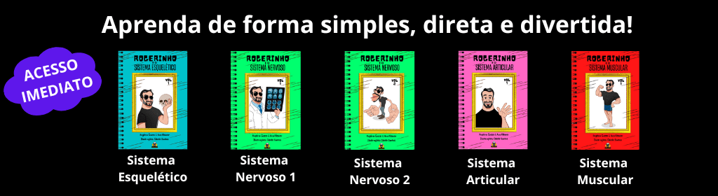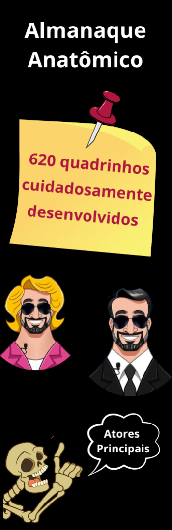 Banner lateral do produto. Segue a descrição do conteúdo: Nós do Anatomia Fácil transformamos os conteúdos dos principais livros de anatomia: sobotta, netter, moore, machado em desenhos.O Almanaque Anatômico Combo 1 reúne mais de 620 quadrinhos com todo conteúdo base que você precisa saber sobre os sistema ósseo, articular, muscular e nervoso. Além disso, em cada 1 dos 5 e-books lotados de conteúdos, você também encontra links com vídeo-aulas organizadas por conteúdo do canal Anatomia Fácil, que te ajudarão ainda mais a fixar o conteúdo.