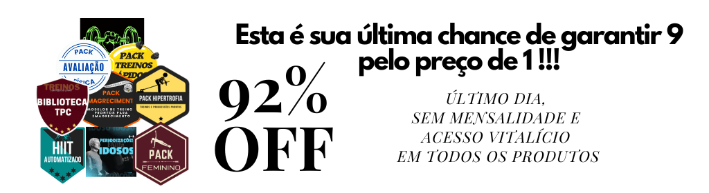 Este SUPER Combo é a junção do aplicativo personalizado + HIIT Automatizado + Pack de treinos rápidos para hipertrofia + Pack Feminino + Pack Avaliação Física + o Pack Emagrecimento + o Pack Hipertrofia + Biblioteca TPC + 5 Bônus exclusivos.