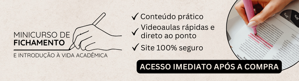 Acesso imediato ao "Minicurso de Fichamento e Introdução à Vida Acadêmica" para apreender a filtrar e organizar as informações mais importantes de textos científicos e acadêmicos.
