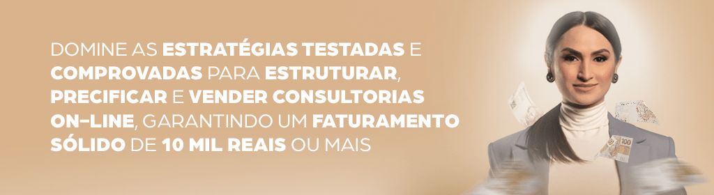 Banner superior do produto. Segue a descrição do conteúdo: Um passo à passo para você desenvolver às habilidades necessárias para faturar até 10 mil reais com Consultorias e Mentorias no formato on-line.