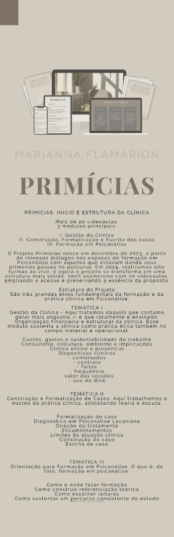 O Projeto Primícias nasce em dezembro de 2023, a partir de intensos diálogos nos espaços de formação em Psicanálise com aqueles que estavam dando seus primeiros passos no percurso. Em 2024, realizamos oito turmas ao vivo, e agora o projeto se transforma em uma estrutura mais sólida, 100% assíncrono com 20 videoaulas, ampliando o acesso e preservando a essência da proposta.