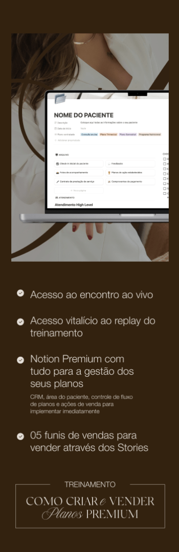 No Treinamento AO VIVO: Como Criar e Vender Planos Premium, você vai aprender um método prático e validado para estruturar, comunicar e vender seus planos sem resistência, sem precisar convencer pacientes e sem ouvir "vou pensar".