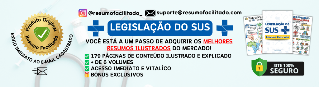 Banner superior do produto. Segue a descrição do conteúdo: LEGISLAÇÃO DO SUS 2026 – RESUMOS ILUSTRADOS
