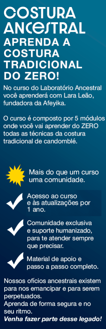 Banner lateral do produto. Segue a descrição do conteúdo: No curso do Laboratório Ancestral, você aprenderá com Lara Leão, Iyawô da Casa de Oxumarê e fundadora da Afeyka. O Costura Ancestral é uma imersão profunda na arte sagrada de confeccionar as roupas tradicionais de Candomblé e o Rum dos Orixás, partindo do zero. É uma oportunidade única para aprender técnicas tradicionais e simbólicas da confecção das nossas roupas.