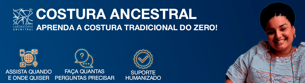 Banner superior do produto. Segue a descrição do conteúdo: No curso do Laboratório Ancestral, você aprenderá com Lara Leão, Iyawô da Casa de Oxumarê e fundadora da Afeyka. O Costura Ancestral é uma imersão profunda na arte sagrada de confeccionar as roupas tradicionais de Candomblé e o Rum dos Orixás, partindo do zero. É uma oportunidade única para aprender técnicas tradicionais e simbólicas da confecção das nossas roupas.