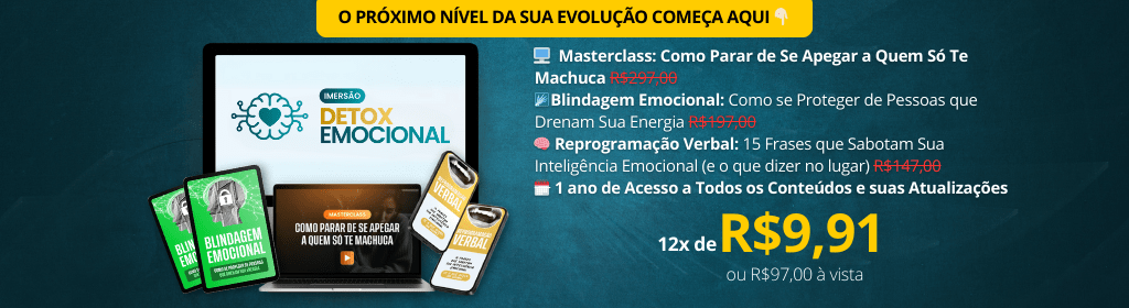 É um detox cirúrgico, profundo e direto, conduzido por quem entende na pele como é viver em relacionamentos que sugam sua energia e destroem sua autoestima — e sabe exatamente o que te impede de se libertar.