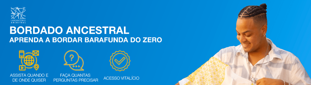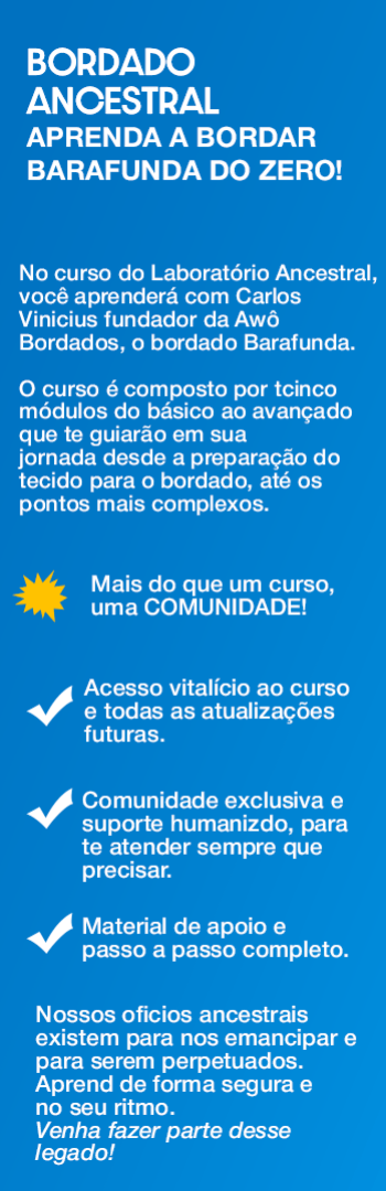 No curso do Laboratório Ancestral, você aprenderá com Carlos Vinicius fundador da Awô Bordados, o bordado de Barafunda.