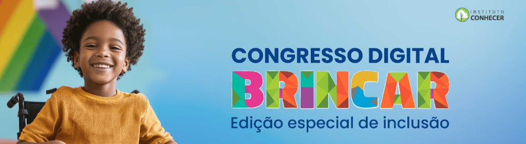 Banner superior do produto. Segue a descrição do conteúdo: O Congresso Brincar Digital - Edição Especial Inclusão 2025 é um evento 100% digital que conecta educadores, profissionais da saúde, familiares e interessados no tema da educação inclusiva. Nosso objetivo é promover uma formação transformadora, acessível e repleta de boas práticas, metodologias e estratégias pedagógicas para fortalecer a inclusão.