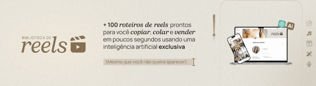 Banner lateral do produto. Segue a descrição do conteúdo: +100 roteiros de Reels estratégicos e persuasivos, prontos para sair da sua bolha e transformar espectadores em clientes .