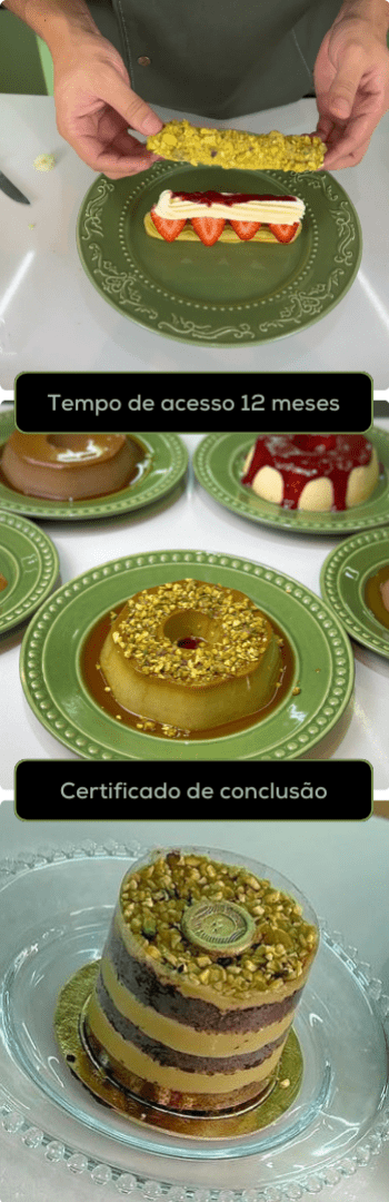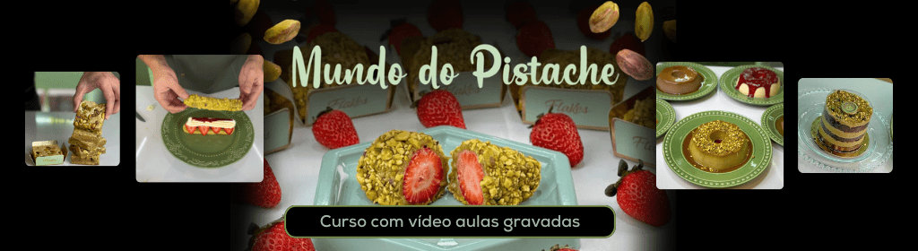 Banner superior do produto. Segue a descrição do conteúdo: O combo perfeito para quem deseja ter todos os Cursos e Apostilas de Pistache da Confeitaria Milionária - Flakes Brazil.