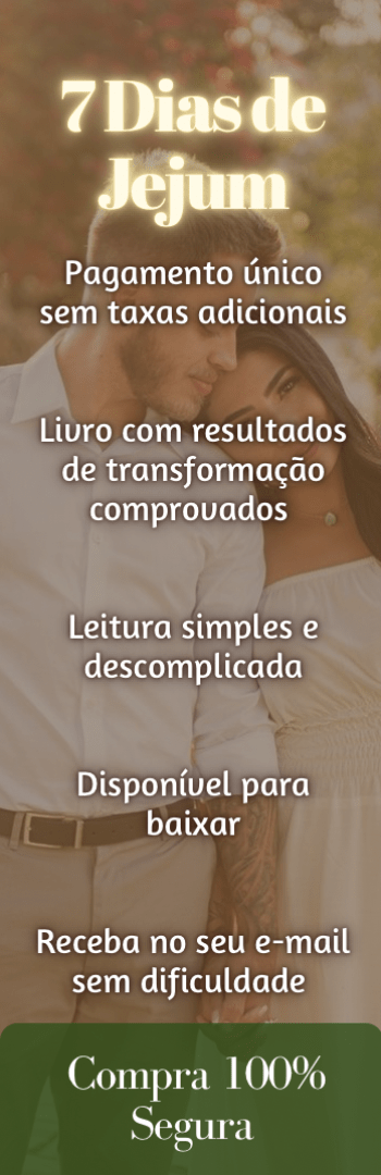Banner lateral do produto. Segue a descrição do conteúdo: Este livro é um guia essencial para casais que buscam renovar e fortalecer seu relacionamento através do jejum. Com atividades práticas, meditações bíblicas e orações específicas, ele aborda diversos aspectos cruciais do casamento: adquirir sabedoria, aprender a perdoar, melhorar a comunicação, superar o cansaço emocional, afastar pensamentos negativos, afastar amantes, e se tornar prioridade na vida do parceiro. Cada jejum é desenhado para promover a cura e a restauração.